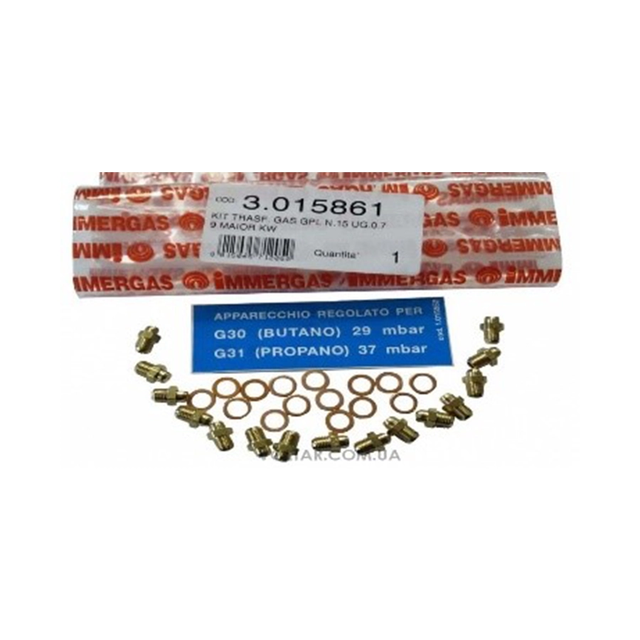 Комплект форсунок (15 шт) для перевода котла на сжиженный газ (LPG, G30/G31). Применяется в навесных газовых котлах итальянского производства Immergas моделей Eolo/Nike Mini, Maior, Zeus. Поставляется в заводской упаковке.